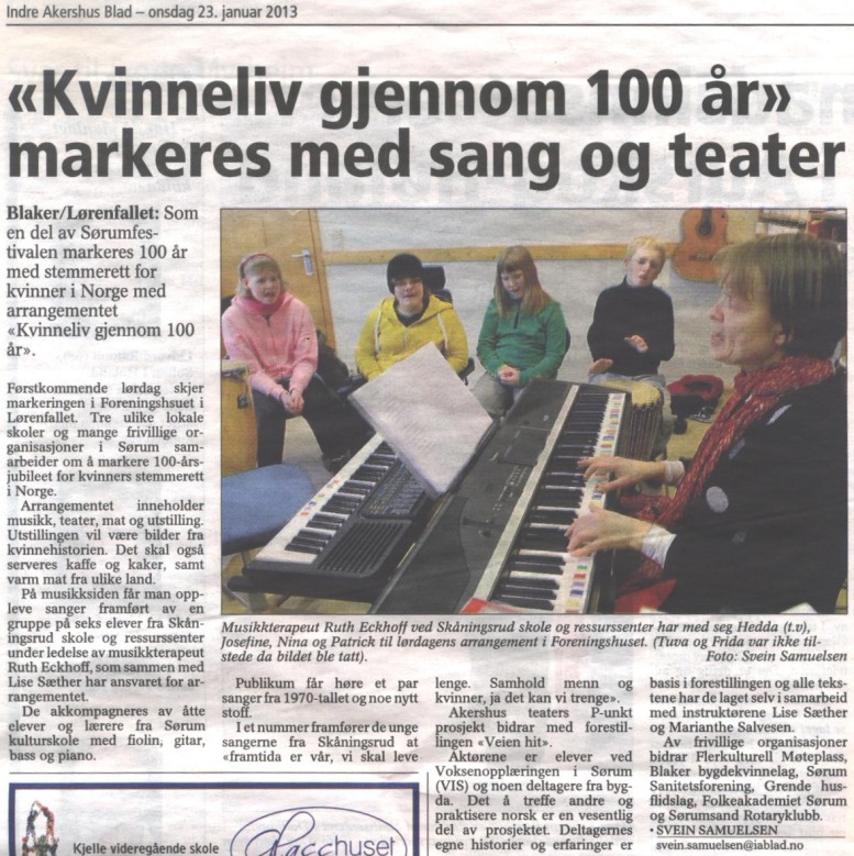 Musikkterapeut Ruth Eckhoff ved Skåningsrud skole har med seg seks elever derfra samt 8 elever og lærere fra Sørum kulturskole. Lørdag 26. januar i Foreningshuset i Lørenfallet. Et program i Sørumfestivalen 2013. 24.01.2013 |