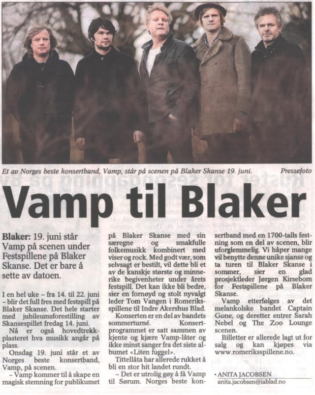 19. juni står Vamp på scenen under Festspillene på Blaker Skanse. Det er bare å sette av datoen 29.04.2013 |