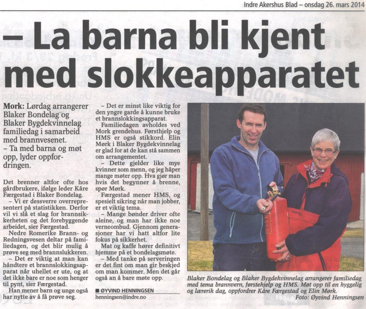 Blaker Bondelag og Blaker Bygdekvinnelag arrangerer familiedag med tema brannvern, førstehjelp og HMS på Mork Grendehus lørdag 29. mars. Lesbare utgave av denne artikkelen fra Indre Akershus Blad her